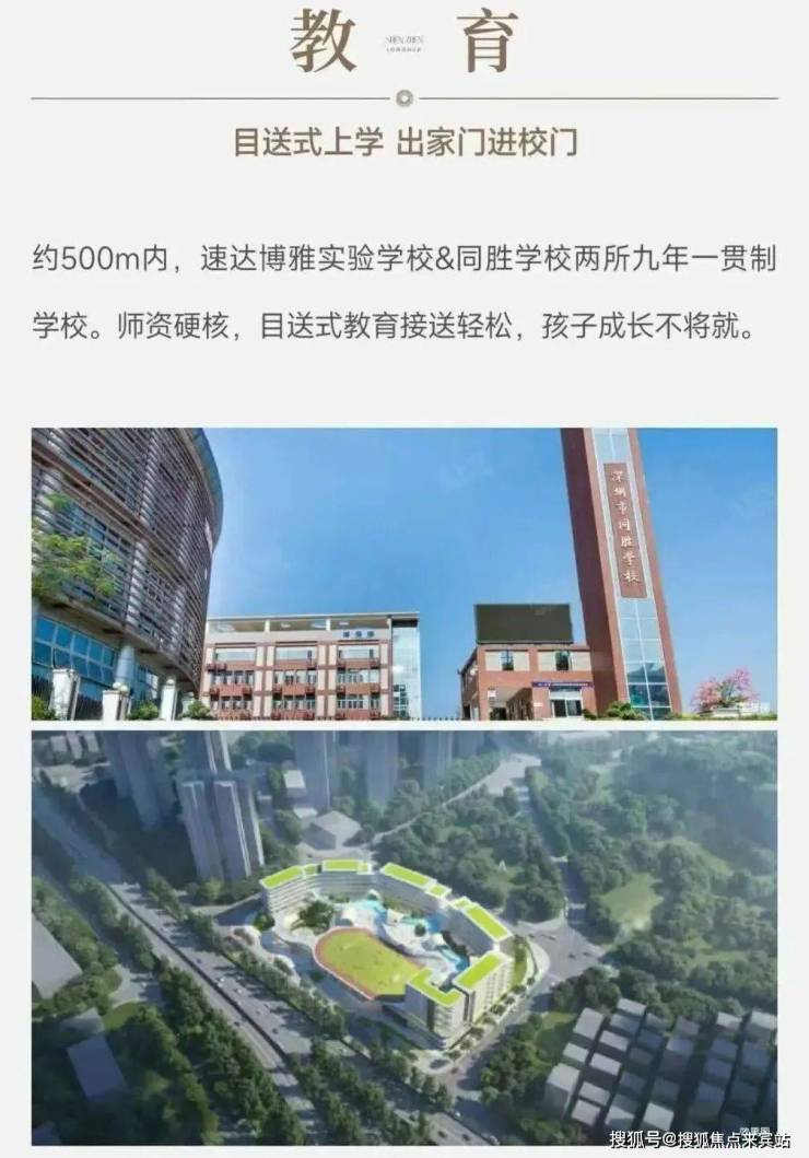 龙华同胜学校,距离小区约300米,该校是1所九年制公办学校,占地约3.4万㎡,规划54个教学班(小学36班、初中18班),在2025年小一录取积分是第六类69.1分,初一录取积分是第六类75.4分,按照当前的积分政策,第六类属于非深户+学区租房生源,所以只要买了房,肯定是能得上该学校的。