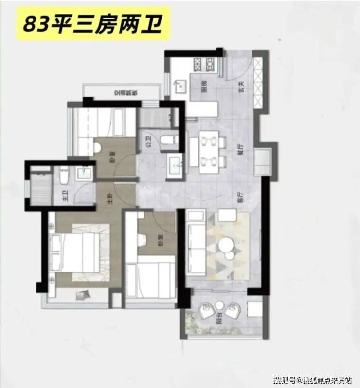 目前流传出来的只有70㎡的3房2厅1卫户型,设计的是竖厅格局,LDKB一体化,S墙设计预留冰箱卡槽位,动静分区,U型厨房,卫生间三段式干湿分离,得房率约100%(包含赠送),西北朝向。