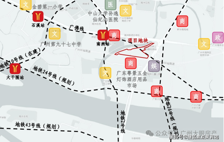 项目距离2号线和广佛线交汇的南洲站直线距离仅约500米,目前北濠涌规划引桥已开建,计划于今年内建成并开通,届时项目通达南洲地铁站将更为便捷。