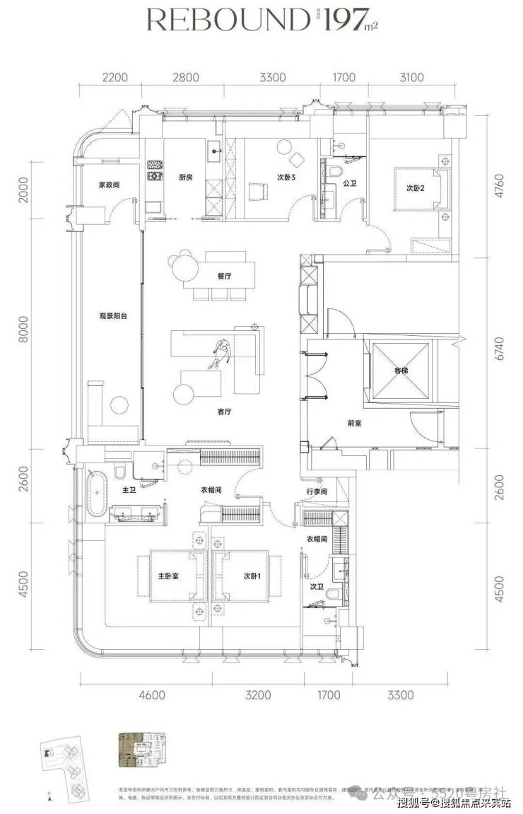 约197㎡ 四房三卫两厅、三面采光、主卧套房、270°转角奢华空间全景落地窗。
