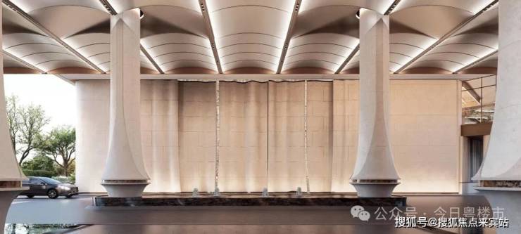 车行大门做了殿堂级落客区,设有天幕和水景,非常具备归家仪式感。每栋设有独立入户大堂,风格与大门相呼应。