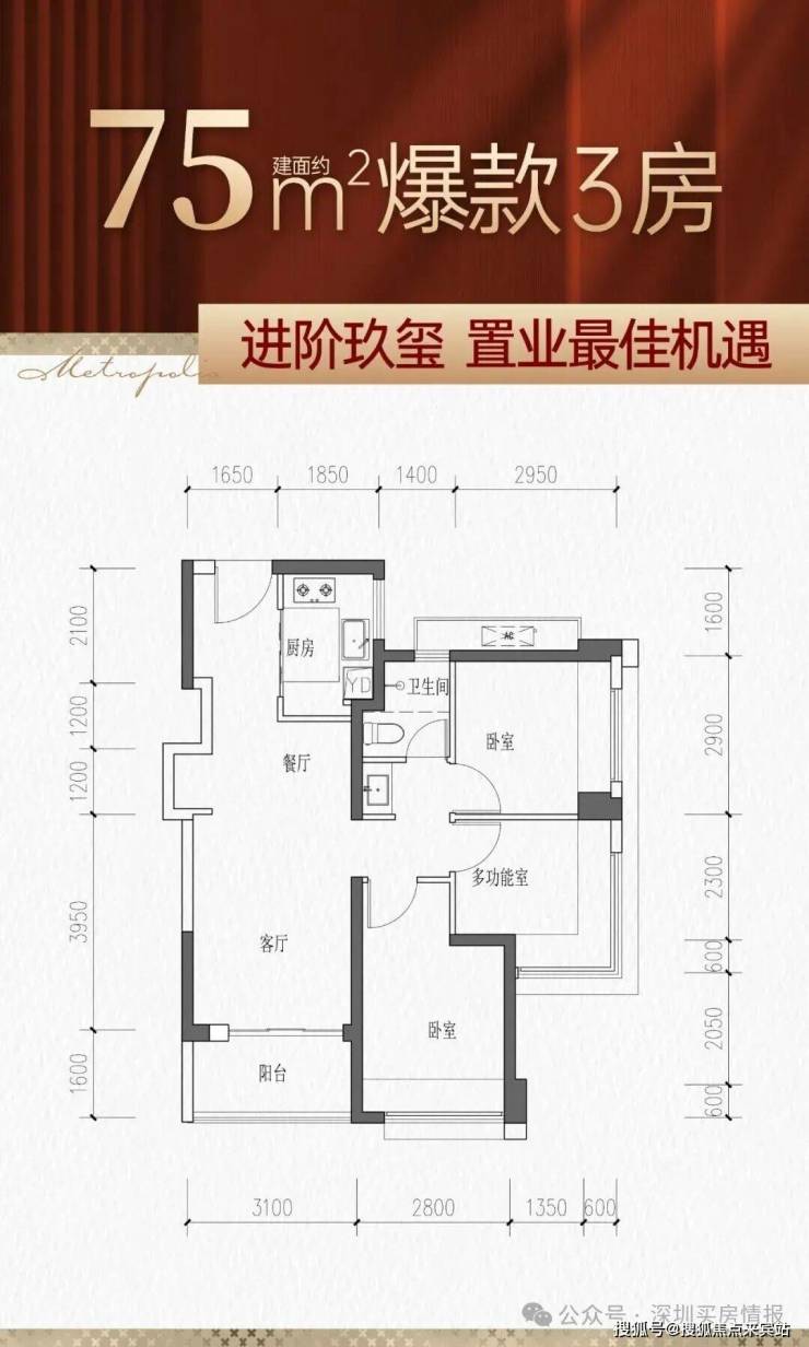 75㎡的3房2厅1卫,设计的是竖厅格局,客厅3.1米开间,LDKB一体化,S墙设计预留冰箱卡槽位,3个卧室分别做到了主卧10.2㎡/次卧8.55㎡/次卧7.95㎡(包含墙体飘窗),U型厨房,卫生间三段式分离,得房率约77%(不含赠送),西南朝向。
