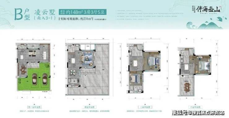 凌云墅B户型(南入户)建筑面积约148㎡,实际可用面积约231㎡(不计花园及露台)