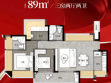 约89㎡:3房2卫,竖厅+主卧套房,动线清晰,收纳体系完善,适合年轻家庭/通勤族;