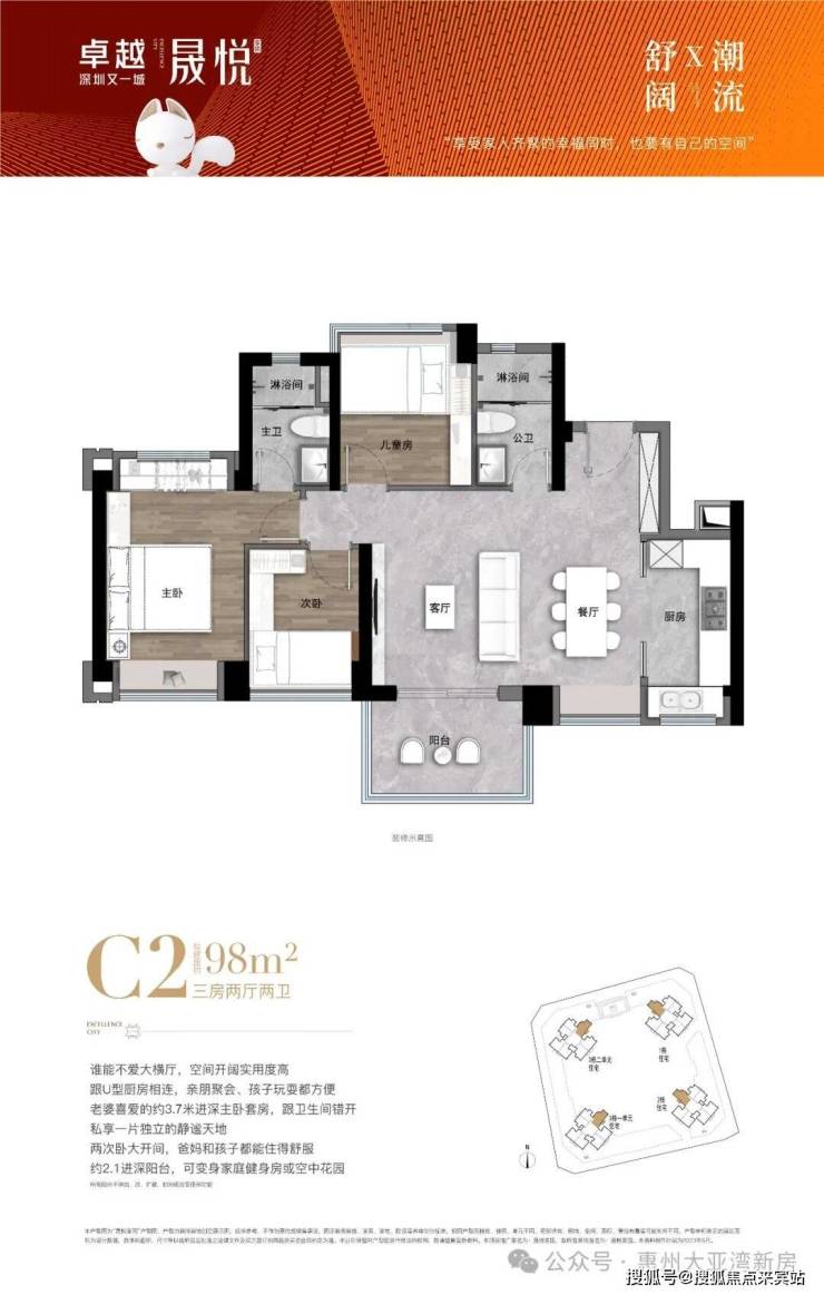 卓越深圳又一城·晟悦 花园在售1栋即将推出2号楼,总层高50层,3梯7户,主力户型建筑面积68-98平2-3房装修交付,总价195万-241万起