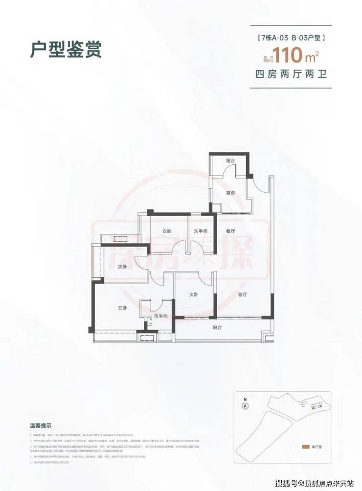 110㎡的4房2厅2卫,设计的是经典竖厅格局,进门入户玄关,客厅3.6米开间,LDKB一体化设计,四开间朝南,动静分区,4个卧室分别做到了主卧13.85㎡/次卧7.6㎡/次卧6.96㎡/次卧6.8㎡(实测面积,去掉墙体),客厅连接次卧出6.2米长(实测)的山景大阳台,L型厨房还带1个生活阳台,卫生间干湿分离,得房率约82%(不含赠送),东南朝向。