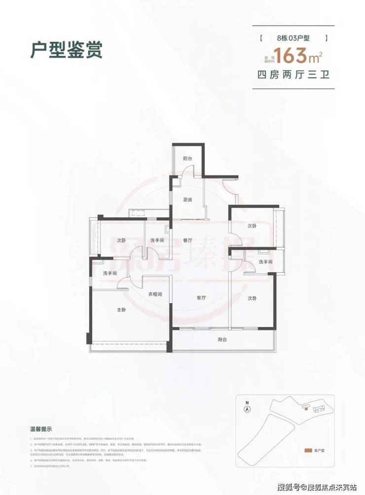 163㎡的4房2厅3卫,设计的是竖厅格局,一梯一户,进门入户玄关,客厅4.2米开间,LDKB一体化设计,三开间朝南,双主卧套房,客厅连接次卧出大阳台,L型厨房还带1个生活阳台,卫生间干湿分离,得房率约82%(不含赠送),东南朝向。