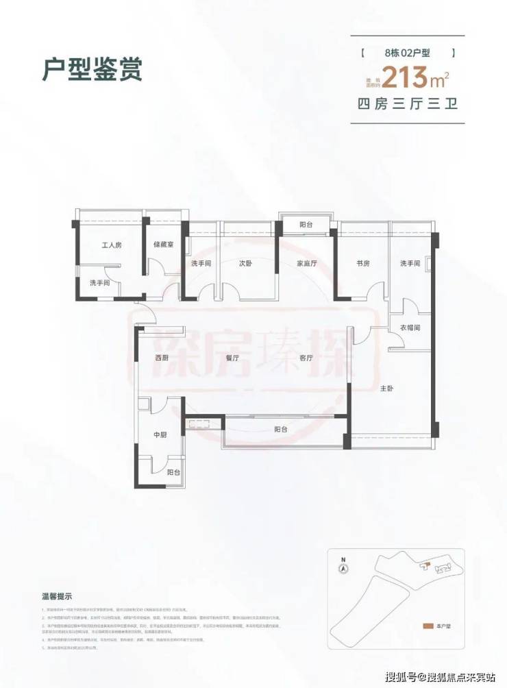 213㎡的4房3厅3卫,设计的是横厅南北通透格局,一梯一户,进门入户玄关,客餐厅6.2米开间,LDKB一体化设计,四开间朝南,双阳台通透,主卧大套间设计,还配有保姆独立套房,中西型多功能厨房,卫生间干湿分离,得房率约82%(不含赠送),阳台主朝东南向。