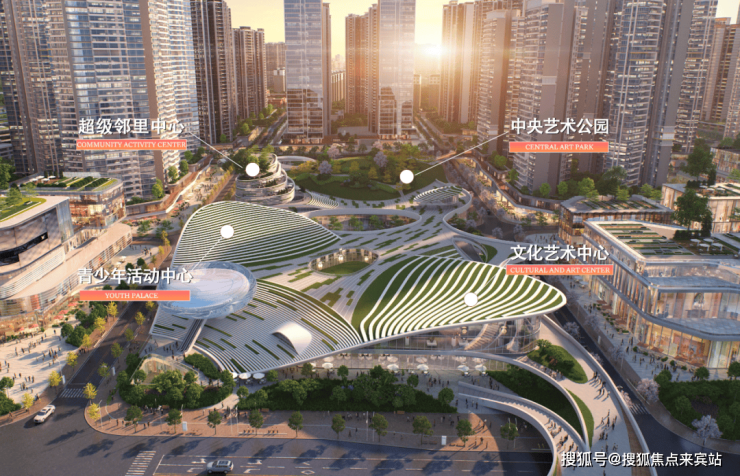 文化层面,项目规划「三馆一园」文化艺术新地标,以青少年活动中心、超级邻里中心、文化艺术中心和中央艺术公园组合式功能空间打造,构筑万博片区全新精神高地。