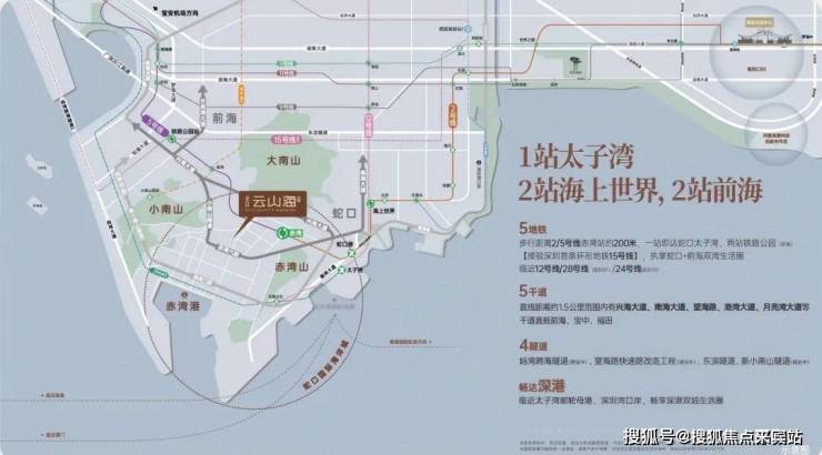 地铁:步行距离2/5号线赤湾站约200米,一站即达蛇口太子湾、两站铁路公园(前海),接驳深圳首条环形地铁15号线。临近12号线左炮台站及规划中的28号线和24号线