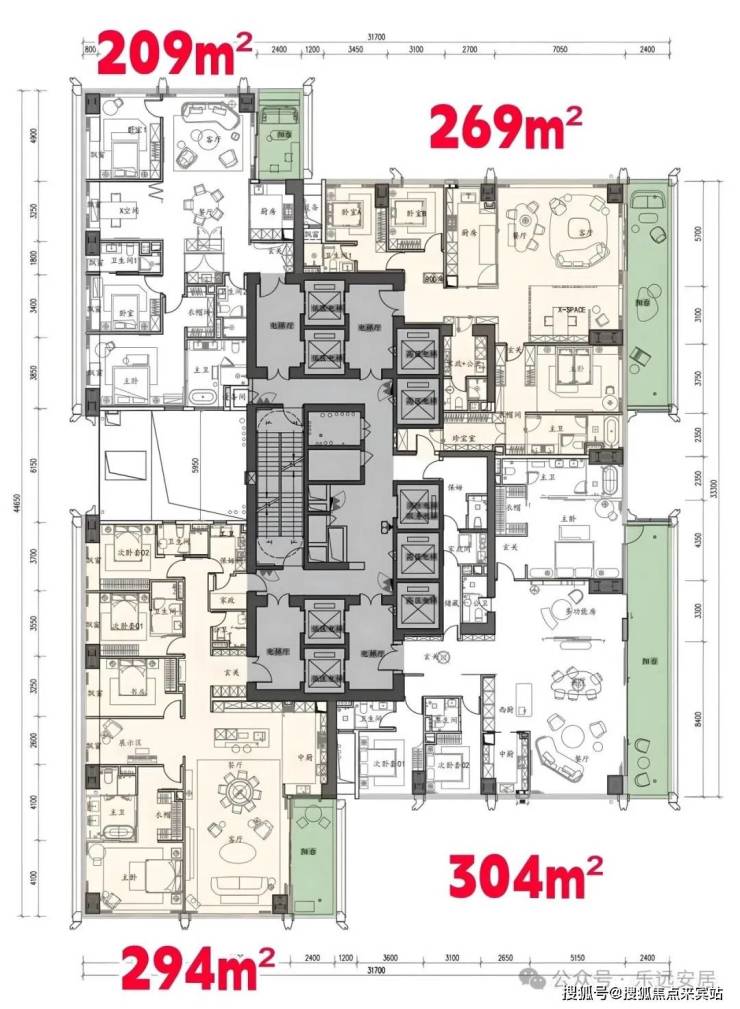 500㎡大平层, 客厅约10米进深、开间12.5米,阳台开间约12.5米,5房(4套房)700㎡大平层,客厅约13.5米进深、开间约11米。阳台开间约15.5米,5房(4套房)