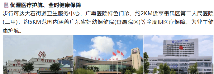 教育上,项目配建 6 班幼儿园,家门口即市一级富丽小学、省一级富丽中学。3 公里内覆盖执信附小、星执学校、大石大山学校、洛溪新城中学等 10 余所优质公立与私立名校,构建 “幼儿园 - 小学 - 中学” 全龄菁英教育矩阵,人文氛围浓厚。医疗方面,2 公里内直达番禺区第二人民医院,5 公里覆盖广东省妇幼保健院番禺院区等三甲机构,全方位守护家人健康。