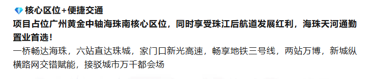 生态上,项目北向直面珠江后航道一线江景,坐拥约 800 米滨江生态岸线,推窗即览壮阔江景。社区内拥 35% 高绿化率,打造半围合式中央园林,规划主题花园、儿童乐园、健康跑道、阳光草坪等全龄空间。周边 3 公里内有北联村公园、植村公园等 140 + 生态公园,内外双园环绕,实现 “推窗见江、出门入园、城央静谧” 的极致生活体验。