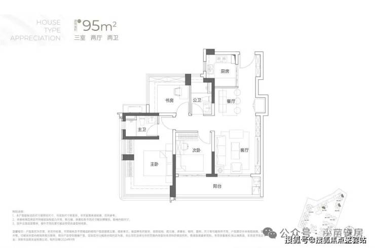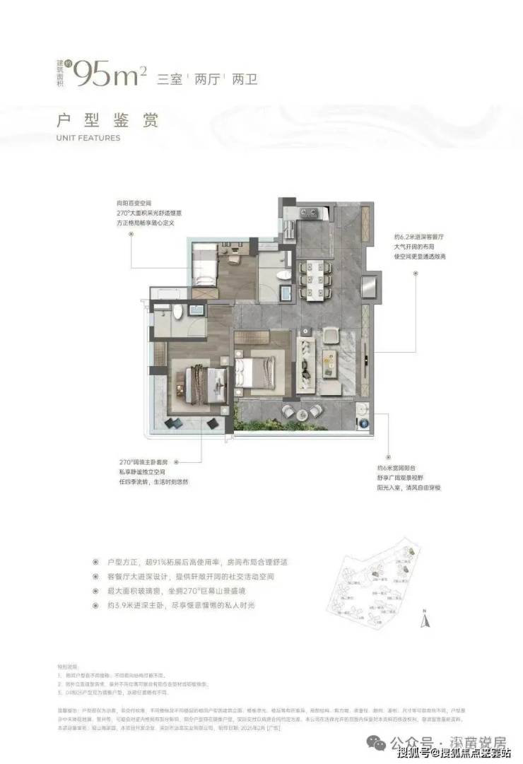 95㎡的3房2厅2卫:户型分布于2栋1-3单元,南向、东北朝向,竖厅格局带6.3米宽大阳台。