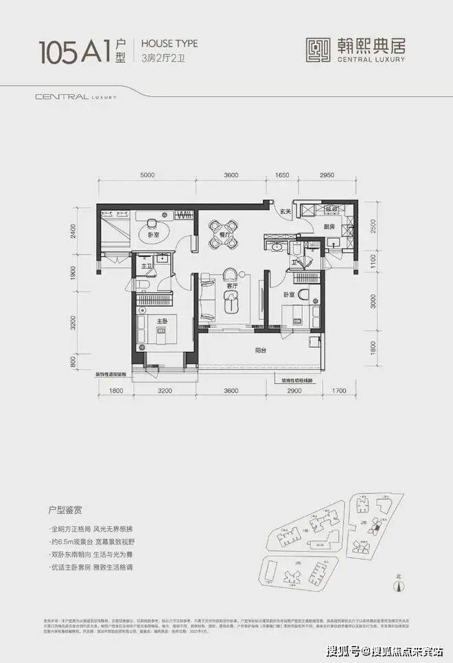 105㎡A1户型:位于三单元03梯腿,3房2卫、典型的双龙抱珠格局、入户带玄关,朝东向,阳台开间6.5米,客餐厅面积约23㎡,主卧套房约16㎡,主客卧分开私密性好。