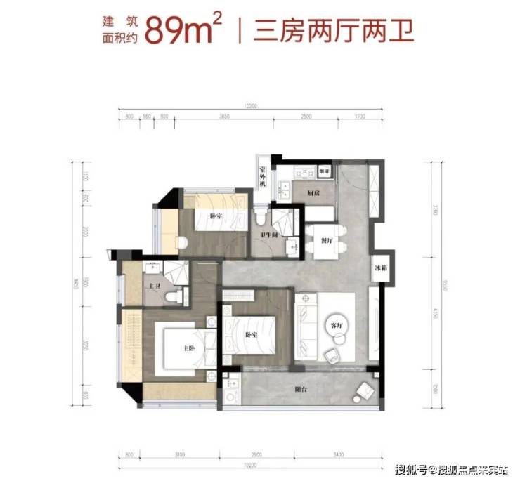 项目 89 ㎡的三房户型,则在各个空间尺度上有了更惊喜的进化,不仅拥有三个阔绰实用的卧室空间,该户型更做到了罕见的约 6.3 米大面宽阳台,既 可以带来 100 ㎡以上户型才拥有的 开阔视野 享受,业主也 可以在阳台做功能分区, 是兼具生活享受与实用功能的高性价比户型。