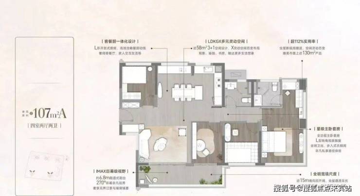 如果想居住尺度再PLUS一些,建面约107平产品绝对不会辜负你的期望。