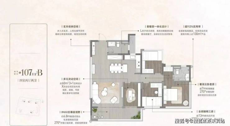 建面约107平产品根据不同改善家庭的需求,打造了两种户型。两个户型都做到南向四开间,确保不同家庭成员的居住舒适度。阳台270°环幕视野,江景、城景一览无余。屋内都预留有X空间,满足家庭进阶中的空间需求。