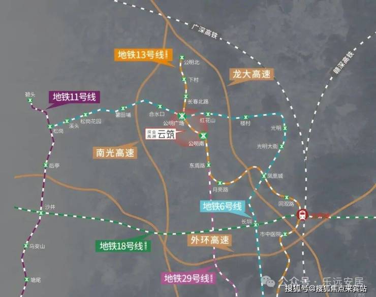 项目交通优势突出,坐拥“双地铁+双高速+主干道”三维立体交通网络,兼顾日常通勤与跨区出行需求,适配南山、福田及光明本地上班族,尤其贴合光明科学城、南山科技园的科创人才通勤需求。地铁配套方面,距离在建地铁13号线(北延)公明南站(又称南庄站)直线距离仅600-800米,步行约10-15分钟可达,该线路被誉为“科创通勤大动脉”,预计2026年全线开通,开通后3站可到南山科技园,6站抵达后海总部基地,40分钟内可通达南山核心、深圳湾口岸,彻底解决跨区通勤痛点。