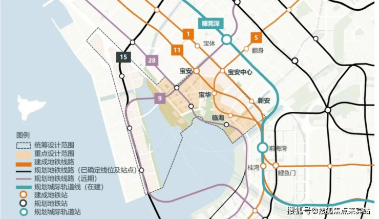 5地铁:距地铁11号线宝安站约800米,毗邻地铁1/5/9号线,28号线(首条跨海内环地铁,规划中)4城轨:深港西部快线 (已规划) 、深惠城际线(在建)、穗深城际线(在建)、深珠城际线(已规划)3高速:沿江高速、深中通道(在建)、深珠通道(已规划)2码头:大铲湾码头、妈湾客运码头1枢纽:前海综合交通枢纽