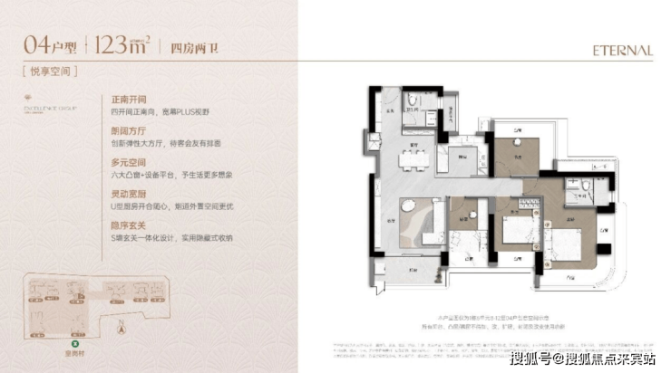 123㎡四房两卫(约1183-1346万):双龙抱珠,南北通透,每个房间面积都还可以,主卧出阳台可以改成一个房间或书房。阳台比较大,但过道狭长,有些浪费。每个功能间都有飘窗,主卧飘窗为弧形转角设计,颜值在线,房间的采光和通透感更好。