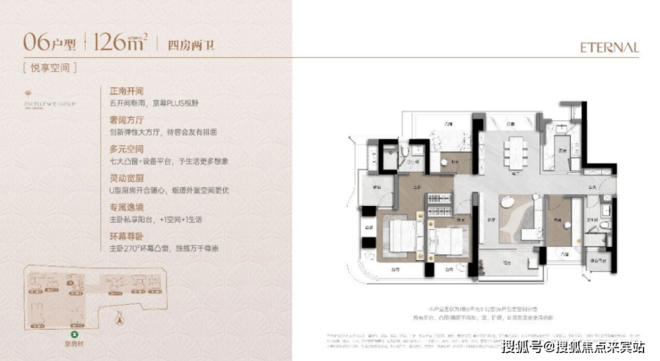 126㎡四房两卫(约1257-1427万):创新户型,弹性大方厅设计,搭配270°环幕视野,俯瞰福田城市景观,主卧套房带独立卫浴与衣帽间,提升居住舒适度。
