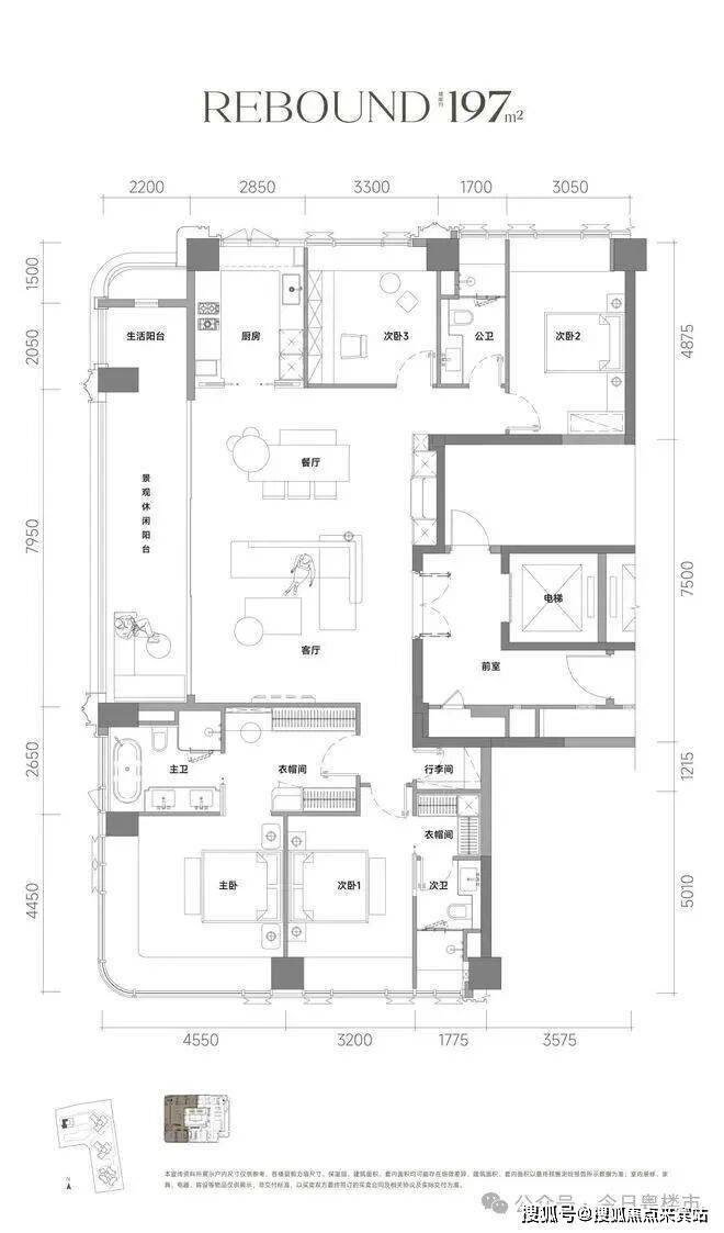 建面约197㎡户型配备7.95米长的景观阳台和2.05米长的生活阳台,连在一起达到了约10米的超长阳台,加上约2.2米的超宽尺寸,整个阳台的面积达到了约22㎡,相较其他竞品来说不是一般的阔绰。