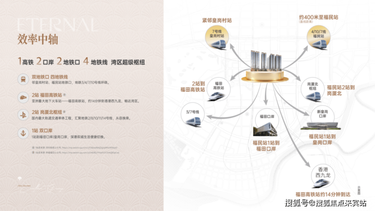 新皇岗口岸建设也为中轴注入巨大活力,预计2026年启用,将成为全球最大陆路口岸和深港24小时通关枢纽。它将连接5条地铁及城轨,与香港北环线无缝对接,实现快速通关,打造深港同城圈,成为深港超级枢纽。