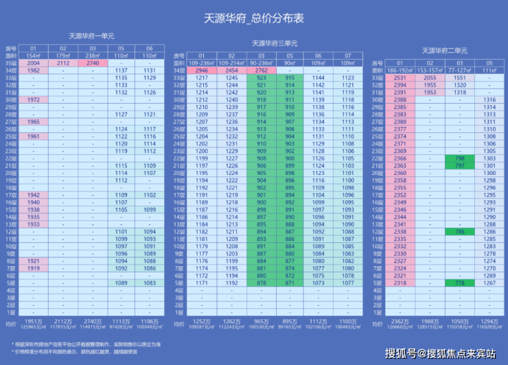 天源华府,总占地面积约1.61万㎡,总建筑面积约7.72万㎡,计容建筑面积约4.79万㎡,容积率3.05,绿化率32.61%,共由3栋33-35层住宅组成,其中1栋1单元住宅35F/3梯5户,1栋2单元住宅33F/2梯4户,1栋3单元住宅34F/3梯6户。