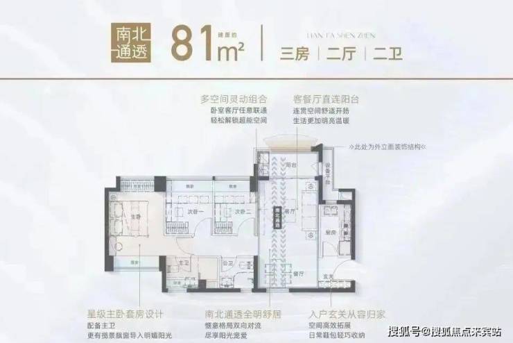 建面约81㎡,独腿户、竖厅、三房两卫,LDK一体化布局,动静分区、室内动线清晰、功能间布局合理,区别于传统竖厅结构,这种布局通风和采光性能更强,动区与主卧可实现双面采光、对流通透,4飘台+1设备平台大幅增加了可使用面积,整体尺度确实是偏紧凑了一些,但在当前的新房市场中80㎡出头能给到三房两卫的属实难得。