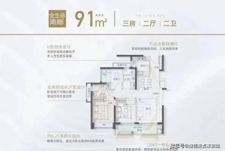 建面约91㎡,两户对称、传统经典竖厅、三房两卫,LDK一体化布局,动静分区、室内动线清晰、预留凹形嵌入式冰箱位、功能间布局合理,6.25米宽景阳台+3飘台+2设备平台大幅增加了可使用面积,相较于81㎡户型,它的整体尺度要舒适一些,更适合改善居住。周边配套已经很成熟。