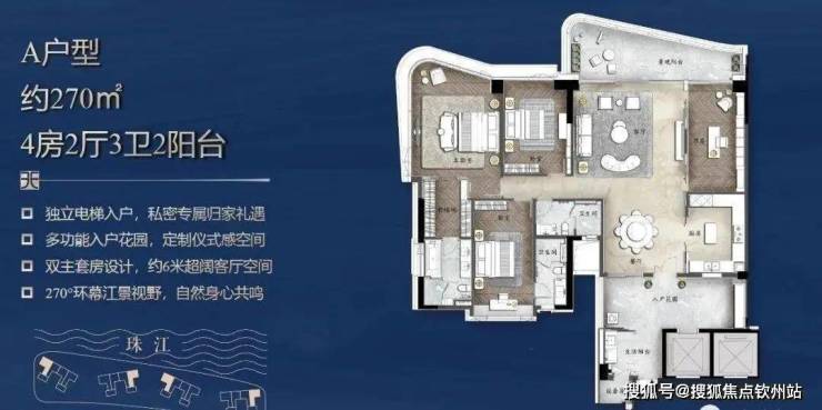 【户型面积】140㎡-270㎡四房双主套;360㎡-480㎡(5房 2 厅双主套+1工人房)三梯两户
