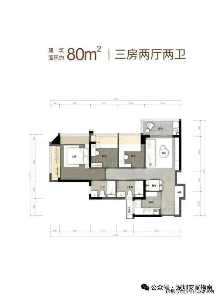 80㎡的3房2厅2卫(新增户型),设计的是竖厅格局,客厅3.4米开间,LDKB一体化,S墙设计预留冰箱卡槽位,动静分区,U型厨房,卫生间干湿分离,得房率约79.6%(不含赠送),阳台4东北朝向。