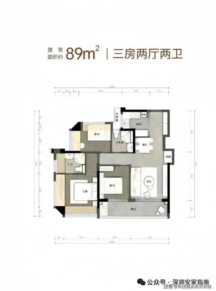 89㎡的3房2厅2卫,1栋04户型,设计的是横厅南北通透格局,客餐厅5.4米开间,LDKB一体化设计,分别做到了主卧16.02㎡/次卧9.07m²/次卧8.26㎡(包含墙体飘窗),客厅连接次卧出9.3m²的巨幕大阳台,L型厨房,卫生间干湿分离,得房率约79.6%(不含赠送),阳台主朝西南向。套内面积70.43m²+赠送面积21.17m²=实用面积91.6m²,加上赠送面积后得房率103.55%。