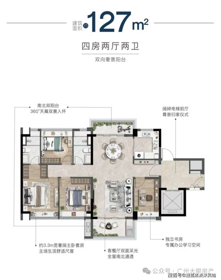 主推建面约104-168㎡全四房户型,两梯两户或两梯三户设计