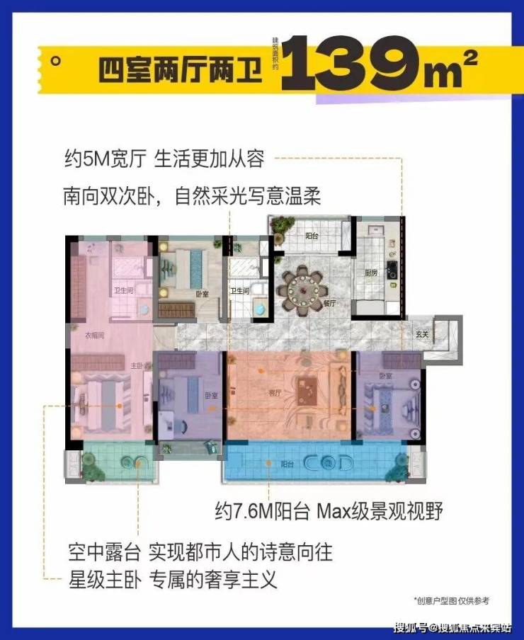 (3)139㎡:4室2厅2卫,南向双次卧,5m宽厅迎四方宾客,空中露台,星级主卧;