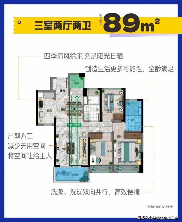 (1)89㎡:3室2厅1卫,全明格局,动静分离,明厨明卫。