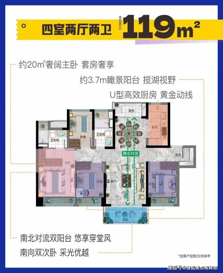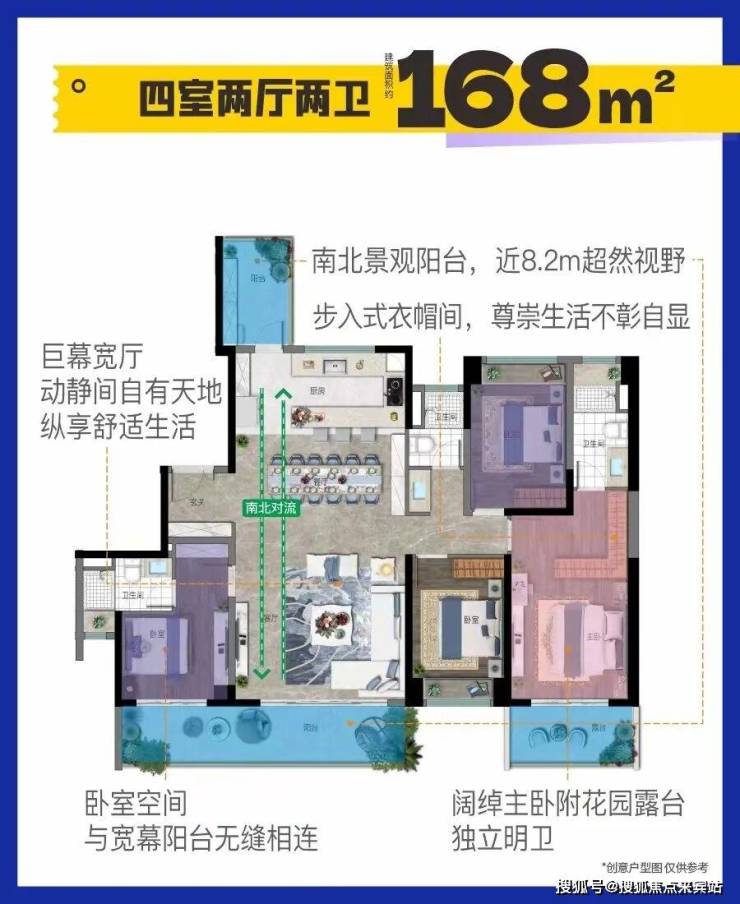(4)168㎡:4室2厅2卫,宽幕大平层,南北通透,约5m面宽会客厅,约8.2m阔景阳台,纵揽180度环幕;